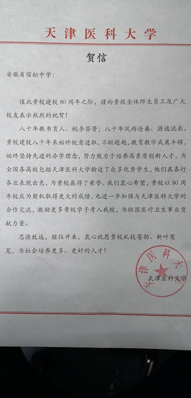 天津醫(yī)科大學(xué)賀信