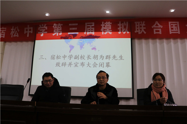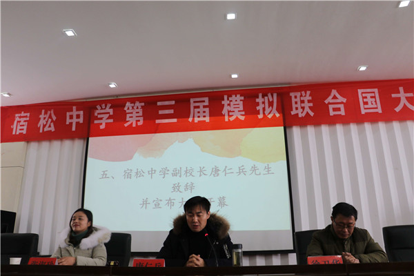 宿松中學第三屆模擬聯合國大會于2018年12月30上午8時30分在宿松中學開幕。副校長唐仁兵、政教處副主任徐衛華、校團委副書記張淑珍及部分團委老師蒞臨現場。我校模聯社團全體成員齊聚一堂,本次大會是我校模聯社團2018級新生第一次參加模聯會議,他們將扮演著“外交官”,“媒體記者”等身份,將就“反恐”和“汽車貿易問題展開激烈的討論。