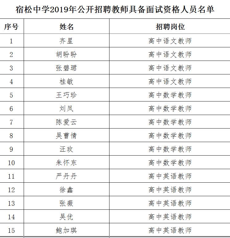 宿松中學(xué)2019年公開招聘教師具備面試資格人員名單公告