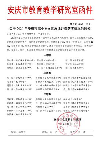 日前,安慶市2020年高中語文優質課大賽落下帷幕,經過認真的準備,激烈角逐,陳天珍老師穩定發揮,從眾多選手中脫穎而出,榮獲一等獎。