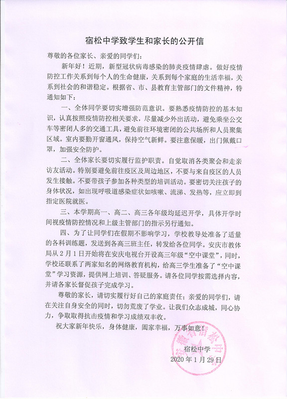 宿松中學(xué)致學(xué)生和家長(zhǎng)的公開信