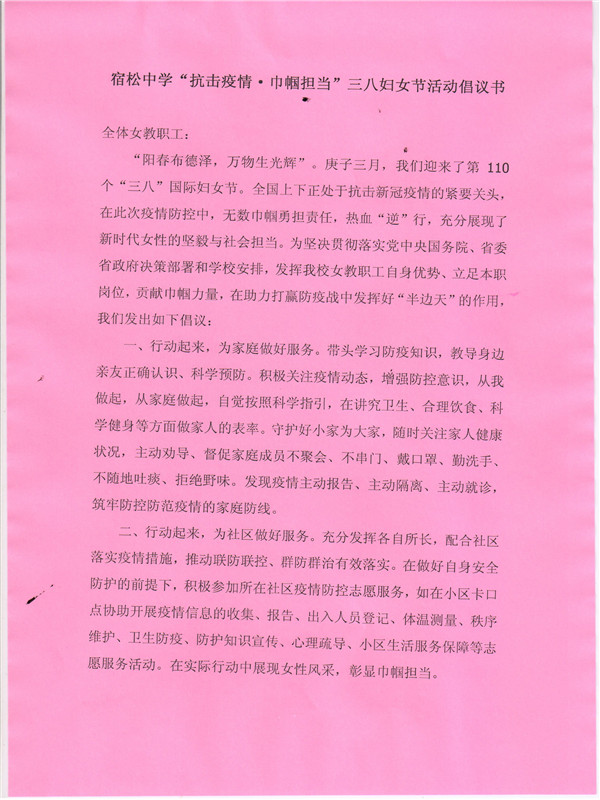 宿松中學“抗擊疫情·巾幗擔當”三八婦女節活動倡議書