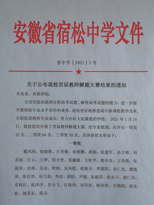 為切實(shí)提高教師分析高考試題、解答高考試題的能力,進(jìn)一步提升教師的專業(yè)水平和學(xué)科素養(yǎng),進(jìn)而更好地推進(jìn)高中新課程教學(xué)改革, 全面促進(jìn)教師專業(yè)成長(zhǎng),努力辦好人民滿意的學(xué)校, 2021年1月16日,我校組織開(kāi)展了首屆教師解題大賽。經(jīng)專家批閱,共評(píng)出一等獎(jiǎng)42名、二等獎(jiǎng)66名、三等獎(jiǎng)38名。具體獲獎(jiǎng)名單如下: