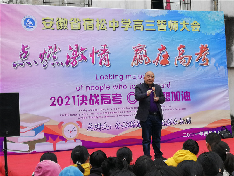 櫻花似雪杏花艷,醉美人間四月天。4月8日,宿松中學在復讀部操場隆重舉行“點燃激情 贏在高考”高三誓師大會。邀請著名高考勵志演講家、學生心理專家陳宏友教授作勵志報告,學校副校長胡為群主持活動,復讀部全體師生參加活動。