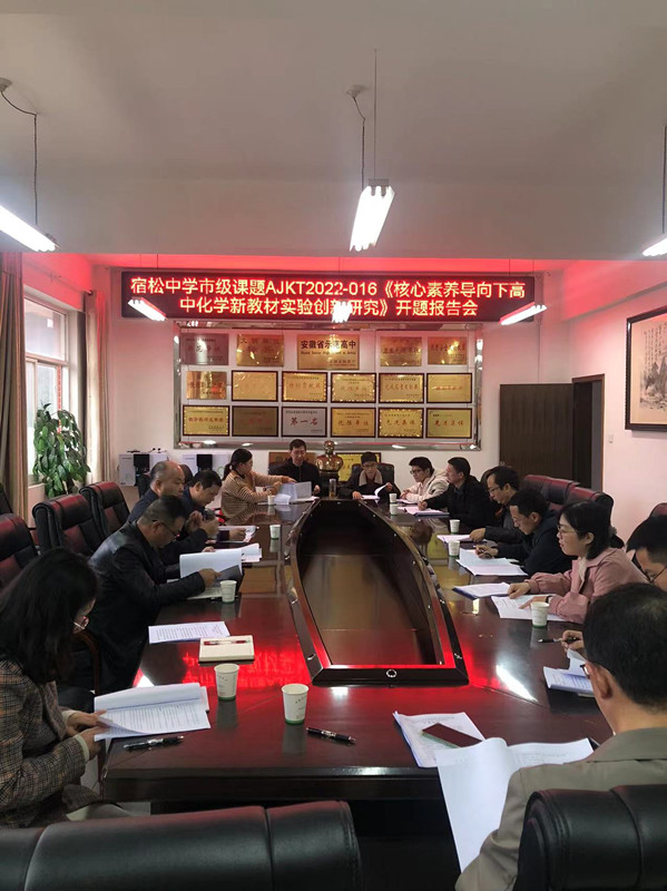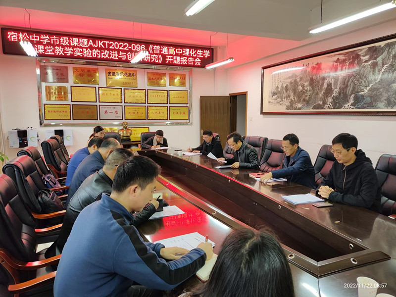 11月22日,宿松縣教育局朱才德主任、楊程鵬主任、歐陽(yáng)明主任一行,蒞臨我校舉行宿松中學(xué)2022年市級(jí)課題開(kāi)題報(bào)告會(huì),對(duì)宿松中學(xué)的兩個(gè)市規(guī)劃課題《普通高中理化生學(xué)科課堂教學(xué)實(shí)驗(yàn)的改進(jìn)與創(chuàng)新研究》、《核心素養(yǎng)導(dǎo)向下高中化學(xué)新教材實(shí)驗(yàn)創(chuàng)新研究》進(jìn)行了現(xiàn)場(chǎng)開(kāi)題論證。胡為群校長(zhǎng)、張松林副校長(zhǎng)、王金旺主任、朱學(xué)文主任及課題組相關(guān)人員參加了會(huì)議。