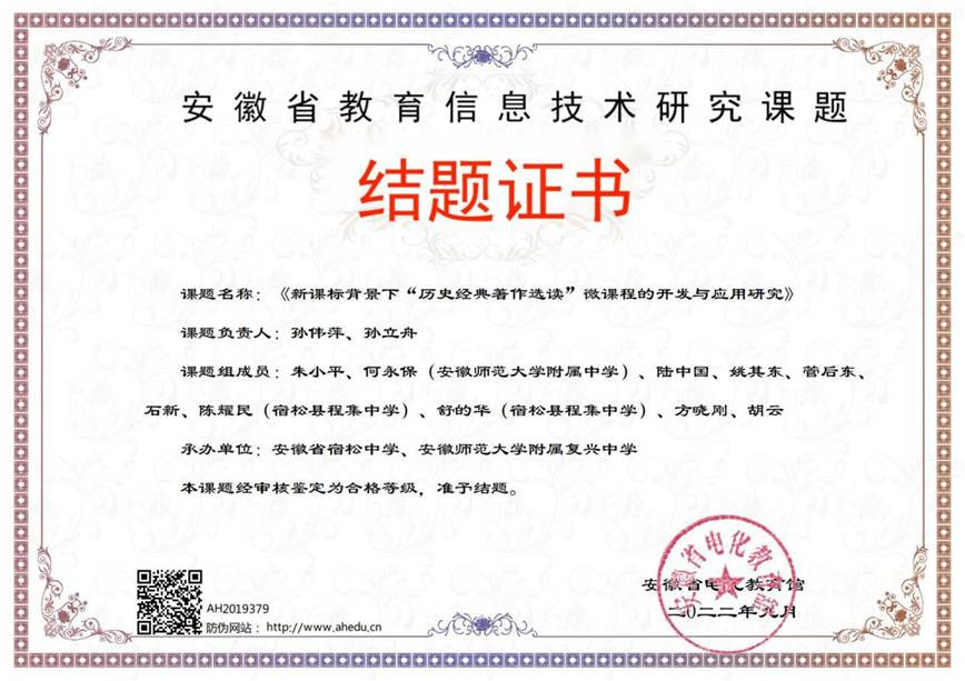 近日,由宿松中學與安徽師范大學附屬復興中學聯合申報、承擔的安徽省教育信息技術研究課題《新課標背景下“歷史經典著作選讀”微課程的開發與應用研究》順利通過結題鑒定。