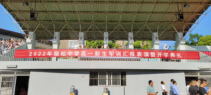 新學期開啟新希望,新里程承載新夢想。9月7日,宿松中學在田徑運動場隆重舉行2022級新生軍訓匯報表演暨新學期開學典禮。宿松縣孚玉鎮黨委副書記、鎮長汪任華,孚玉鎮人民武裝部副部長張海濱,教育局黨委委員鄭振家,宿松中學黨總支書記張偉中、校長胡為群、黨總支副書記劉早田,黨總支委員周少華、副校長石雅游、徐衛華、張松林出席典禮。全體承訓教官、學校各職能部門負責人、高一年級全體班主任及新生參加典禮。軍訓匯報、典禮由校黨總支書記張偉中主持。