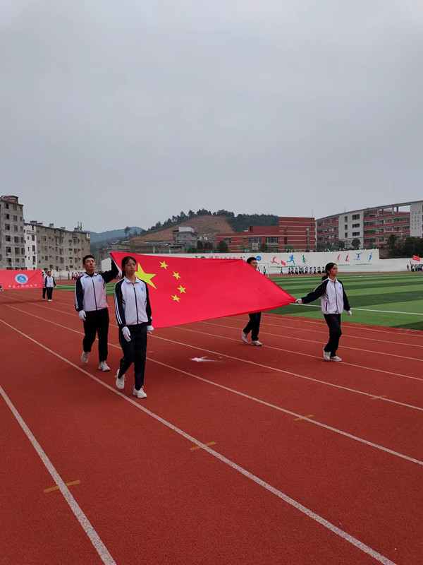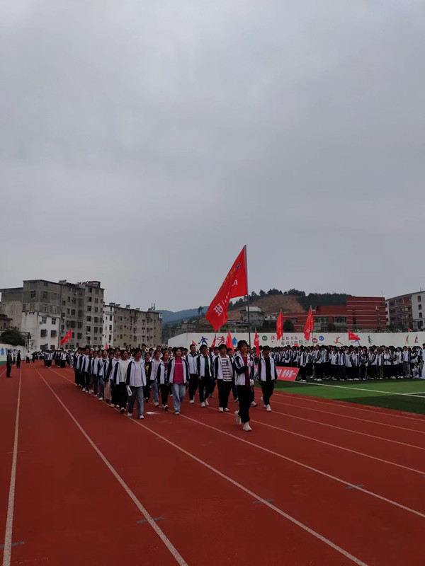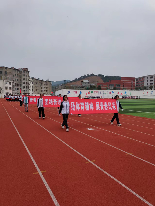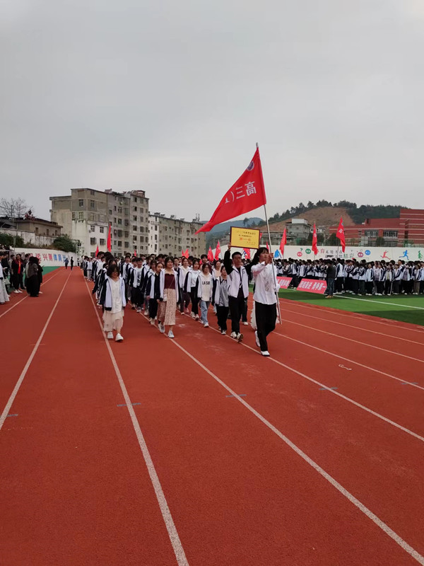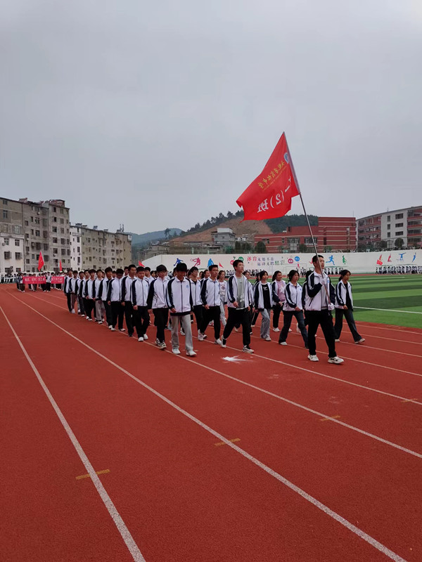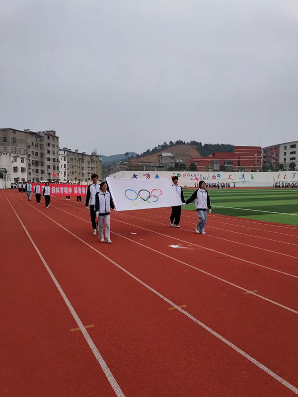 上午八時,入場式開始。伴隨著《運(yùn)動員進(jìn)行曲》的旋律,國旗方陣、校旗方陣、奧林匹克五環(huán)旗方陣、宣傳標(biāo)語方陣、啦啦操表演方陣、各班代表隊及黨員志愿者方陣依次入場。他們踏著整齊的步伐,喊著響亮的口號,神采飛揚(yáng),昂首闊步走過主席臺,踏上綠茵場地。