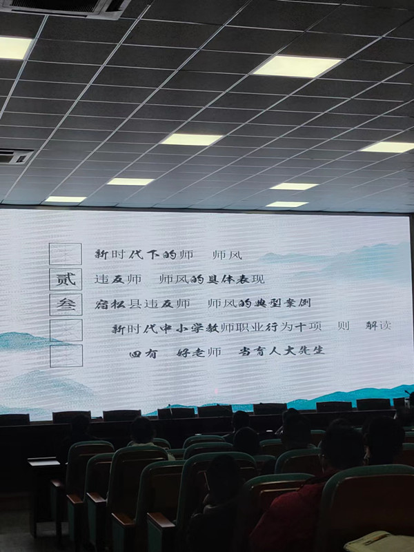 為進(jìn)一步規(guī)范教師職業(yè)行為,增強(qiáng)教育工作者的廉潔自律意識(shí),不斷提高師德修養(yǎng),增強(qiáng)敬業(yè)意識(shí),筑牢師德師風(fēng)防線,11月22日晚,縣紀(jì)委黨風(fēng)政風(fēng)督查室彭歡慶同志來(lái)到宿松中學(xué),作了一場(chǎng)師德師風(fēng)專題報(bào)告會(huì)。報(bào)告會(huì)由校黨總支書記張偉中主持,全體行政人員及教師參會(huì)。