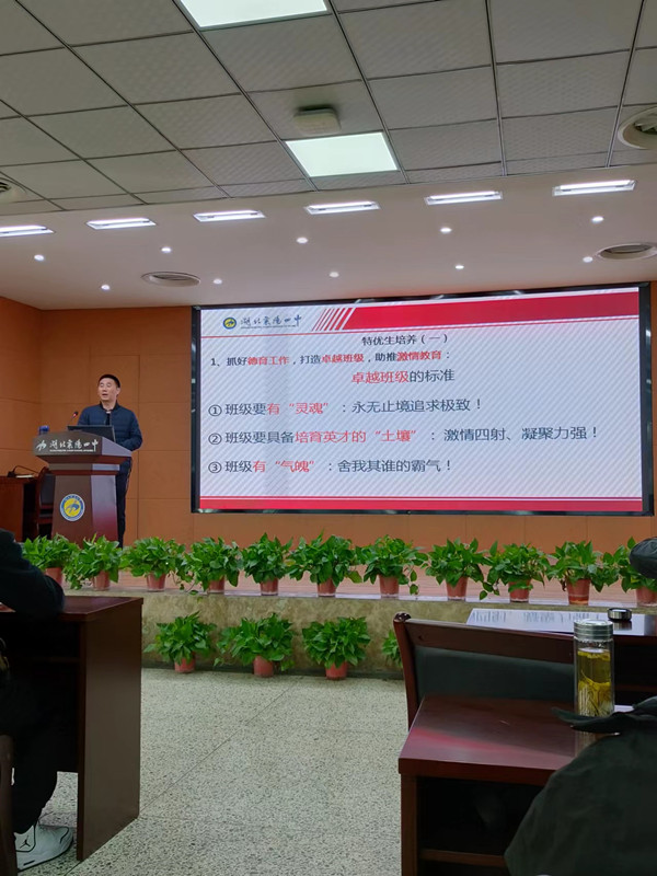 參觀結束后,全體成員聽取了專題講座,講座由2023屆高三年級主任蘇挺主講。蘇主任先從年級小組團隊、班主任團隊、學生管理、教學管理等四個方面介紹了襄陽四中在年級管理上的思路和做法,再從德育和精準培優兩個方面分享了襄陽四中在特優生培養工作上的先進經驗。蘇主任的講座內容詳盡細致,分享了一系列實操性極強的方案與制度,干貨滿滿。全體成員全方位感受到了襄陽四中分秒必爭的學習氛圍、嚴謹踏實的工作作風、科學高效的備考策略、精準細致的管理制度、浸潤人心的德育工作、追求卓越的文化內涵和多元競放的教育理念。