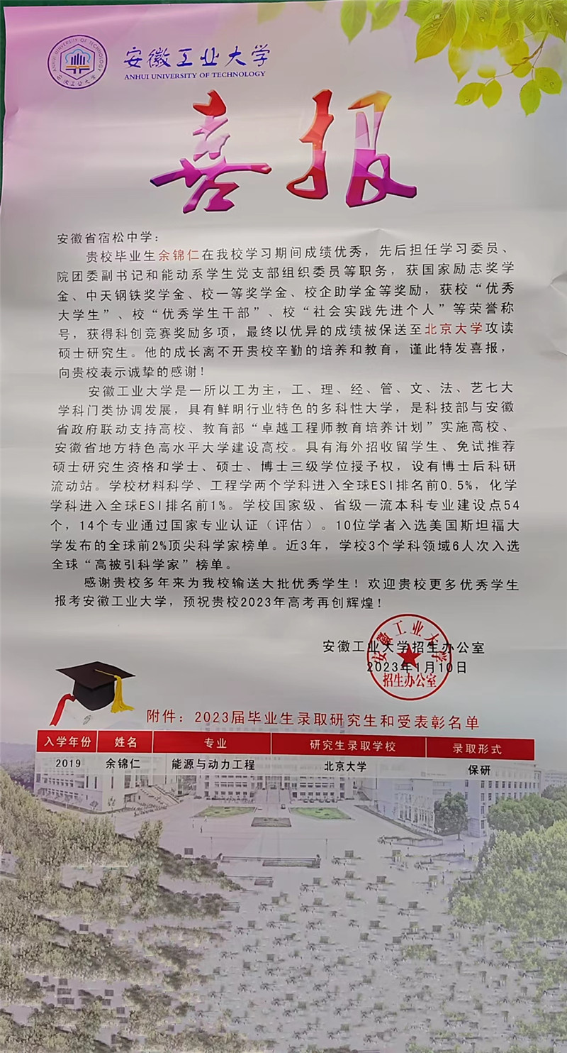 喜報:我校2019屆畢業生余錦仁以優異成績被保送北京大學
