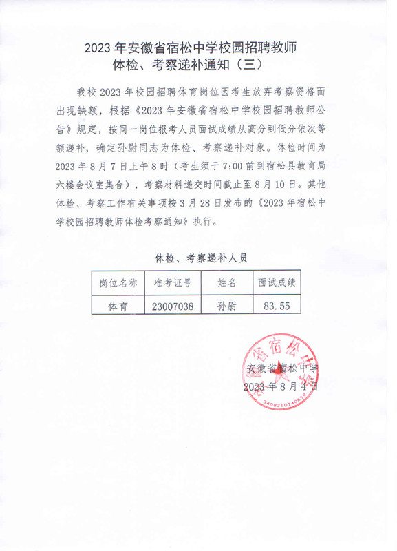 2023年安徽省宿松中學校園招聘教師體檢、考察遞補通知(三)