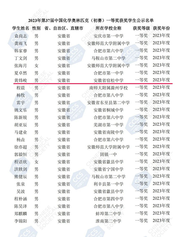 9月19日,第37屆中國化學奧林匹克競賽(安徽賽區)成績公布,宿松中學高三(13)班黃煒峻同學榮獲一等獎,這是我校學生首次在奧賽中獲得省級一等獎。