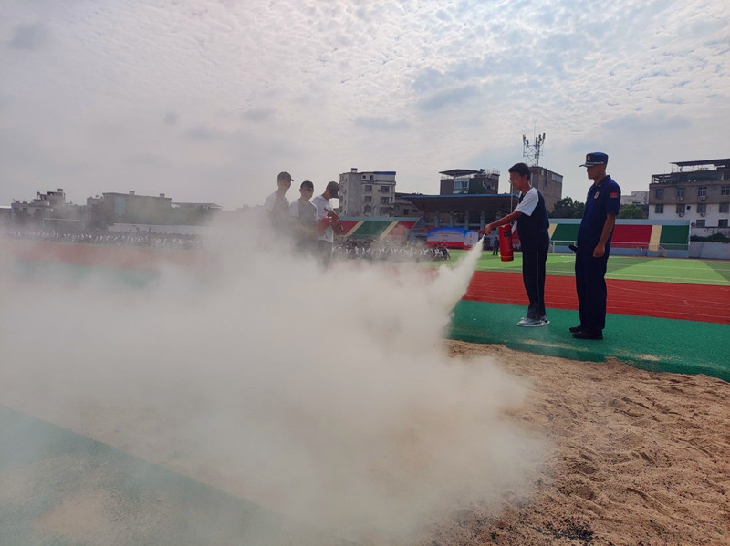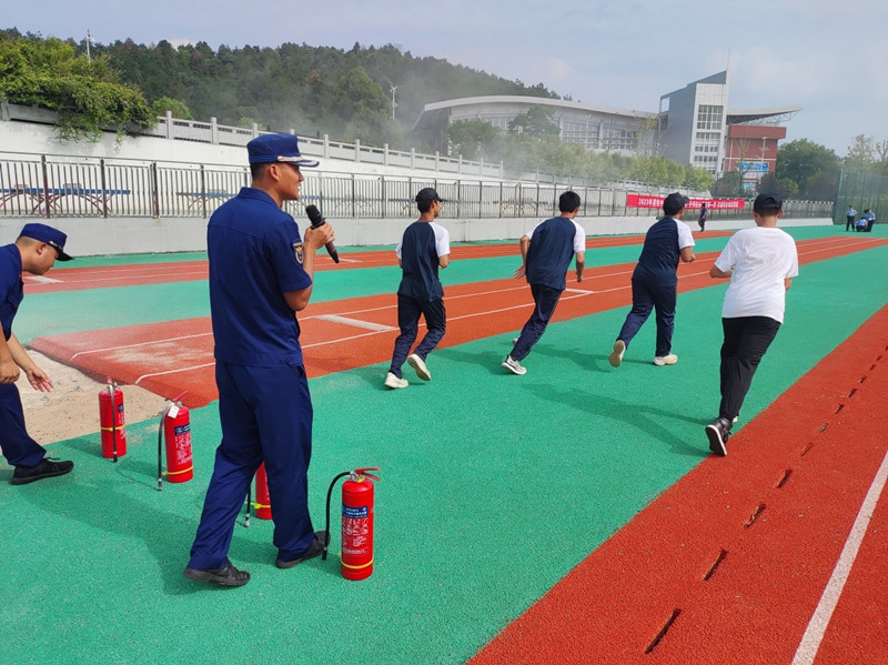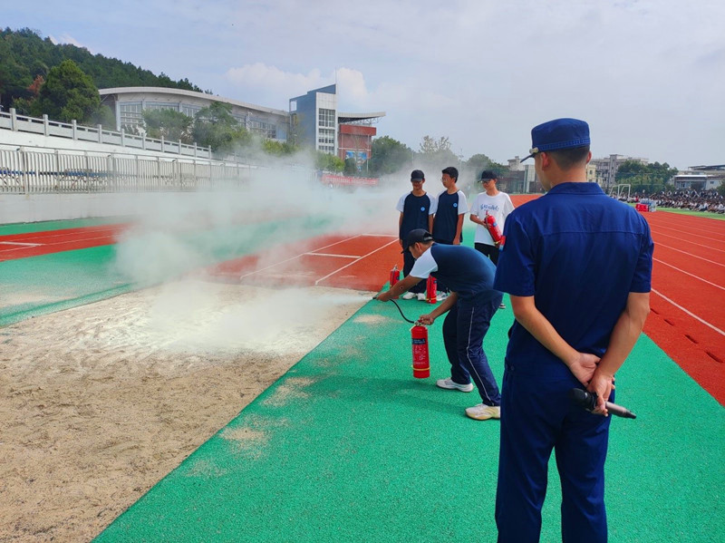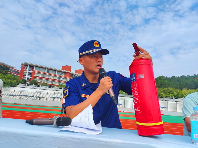 消防官兵還向我校高一新生講解了滅火器的使用常識,隨機抽取學生演練操作,并對學生的操作進行點評。