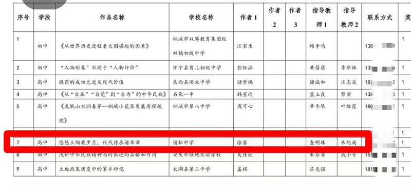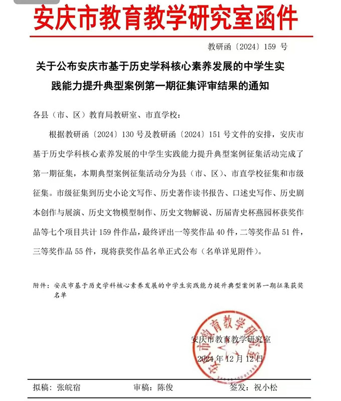 近日,安慶市基于歷史學科核心素養發展的中學生實踐能力提升典型案例第一期征集評審結果揭曉。宿松中學高一(6)班徐睿表現卓越,其歷史小論文《悠悠土陶載歲月,代代傳承譜華章》,憑借對家鄉陶器文化深入的史料挖掘、嚴謹分析與獨特見解,展現出非凡學術素養與研究能力,在眾多作品中脫穎而出,榮獲市一等獎。