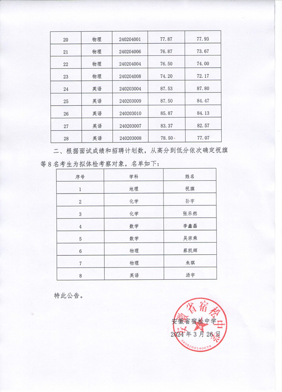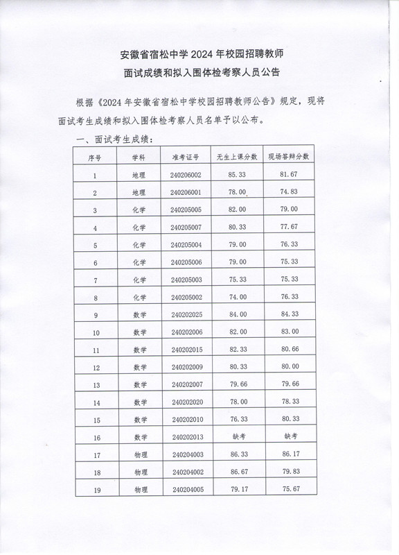 安徽省宿松中學2024年校園招聘教師面試成績和擬入圍體檢考察人員公告
