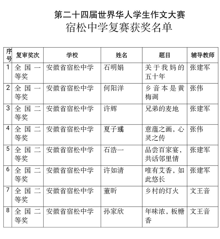 近日,第二十四屆世界華人學生作文大賽評選結果揭曉,宿松中學共有八名學生獲獎,其中石明娟、何陽洋榮獲全國一等獎,許輝、夏子彧、石浩一、許如清、董昕、孫家欣榮獲全國二等獎。同時,張建軍、張偉、文王音三位教師榮獲“優秀指導教師”稱號。