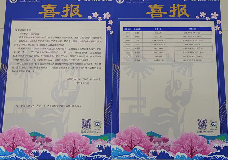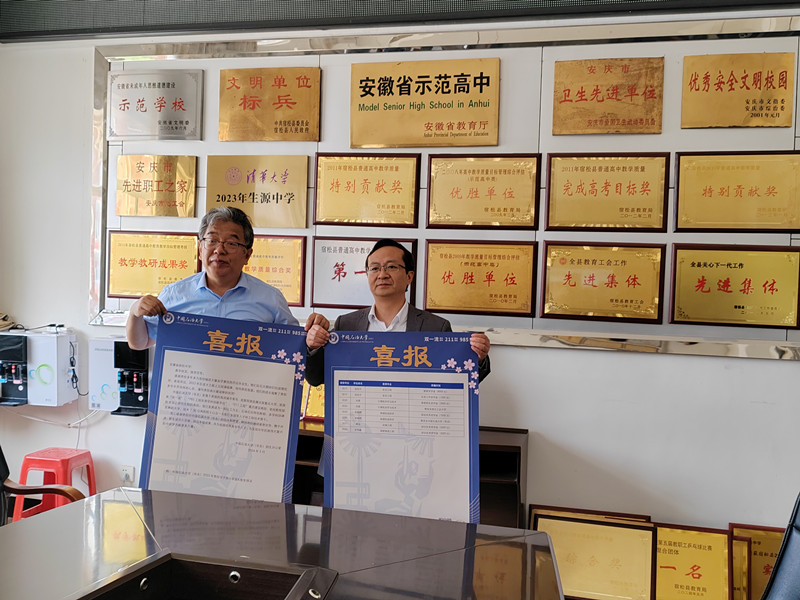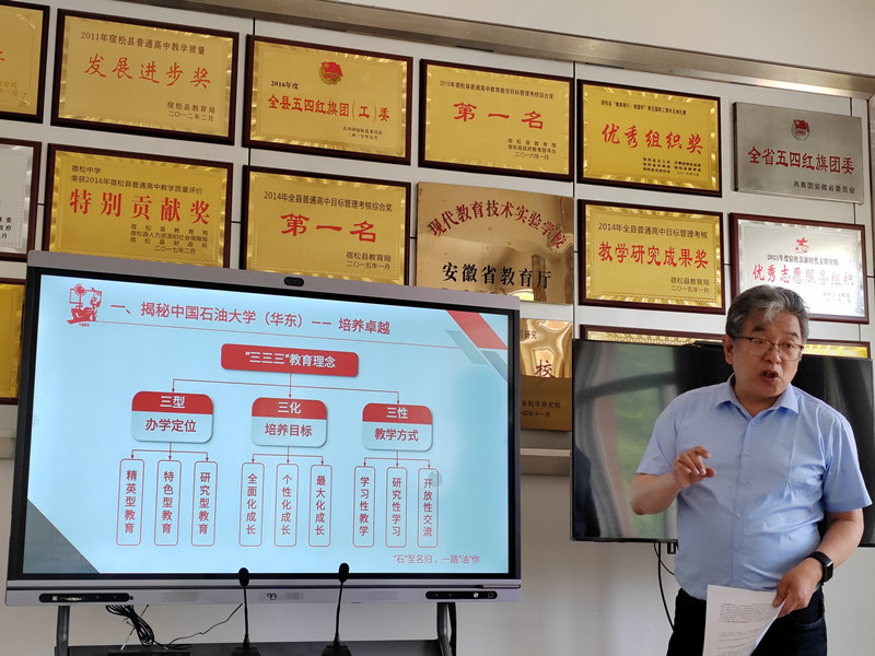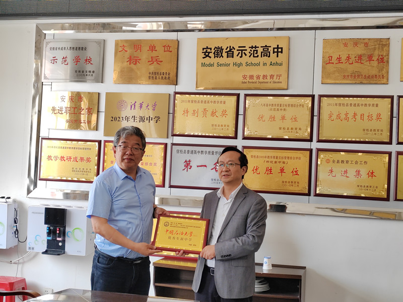 訪問期間,陳勇校友介紹了中國石油大學(xué)(華東)創(chuàng)校、發(fā)展、壯大的艱辛歷程,卓越功勛,教育理念,院系建設(shè)等情況,并代表中國石油大學(xué)(華東)向宿松中學(xué)頒發(fā)了“中國石油大學(xué)(華東)優(yōu)秀生源中學(xué)”獎(jiǎng)牌。胡為群校長代表宿松中學(xué)對(duì)陳勇校友的蒞臨表示歡迎,并向陳勇校友介紹了近幾年我校建設(shè)和教育教學(xué)成果。張偉中書記代表宿松中學(xué)感謝中國石油大學(xué)(華東)和陳勇校友的信任和厚愛,期待兩校攜手共進(jìn),共為祖國培育高水平人才,為實(shí)現(xiàn)中華民族偉大復(fù)興的中國夢(mèng)貢獻(xiàn)更多力量。