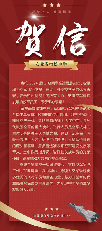 空軍招飛局向宿松中學(xué)發(fā)來賀信