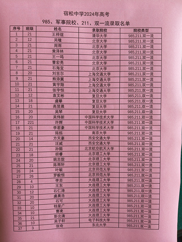 宿松中學(xué)2024年高考 985、軍事、211、雙一流院校錄取名單