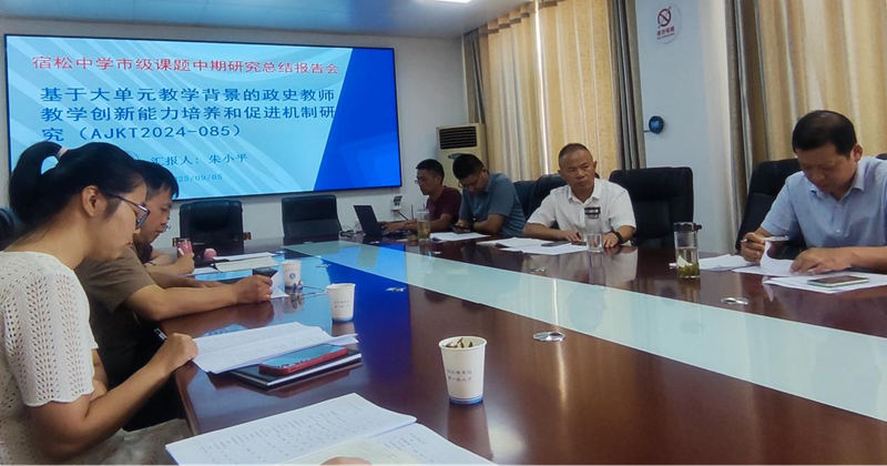 9月5日,宿松中學市級課題《基于大單元教學背景的政史教師教學創(chuàng)新能力培養(yǎng)和促進機制研究》中期研究總結報告會順利舉行。會議由課題負責人朱小平老師主持,宿松縣教育局教研室領導歐陽明、朱旭南,宿松中學副校長張松林、教研副主任楊林盛以及課題組全體成員出席。